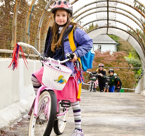 At the Go By Bike sign underneath the aerial tram in south waterfront