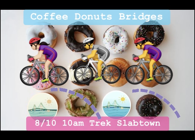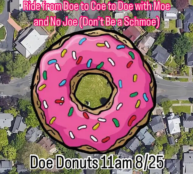 This ride starts at Sunrise Coffee (Mount Tabor) at 7:00 AM, and ends at Breakfast on the Bluffs at 9:00 AM. En route we will stop at several NE Portland donut shops for ride fuel and supplies for Breakfast on the Bluffs.