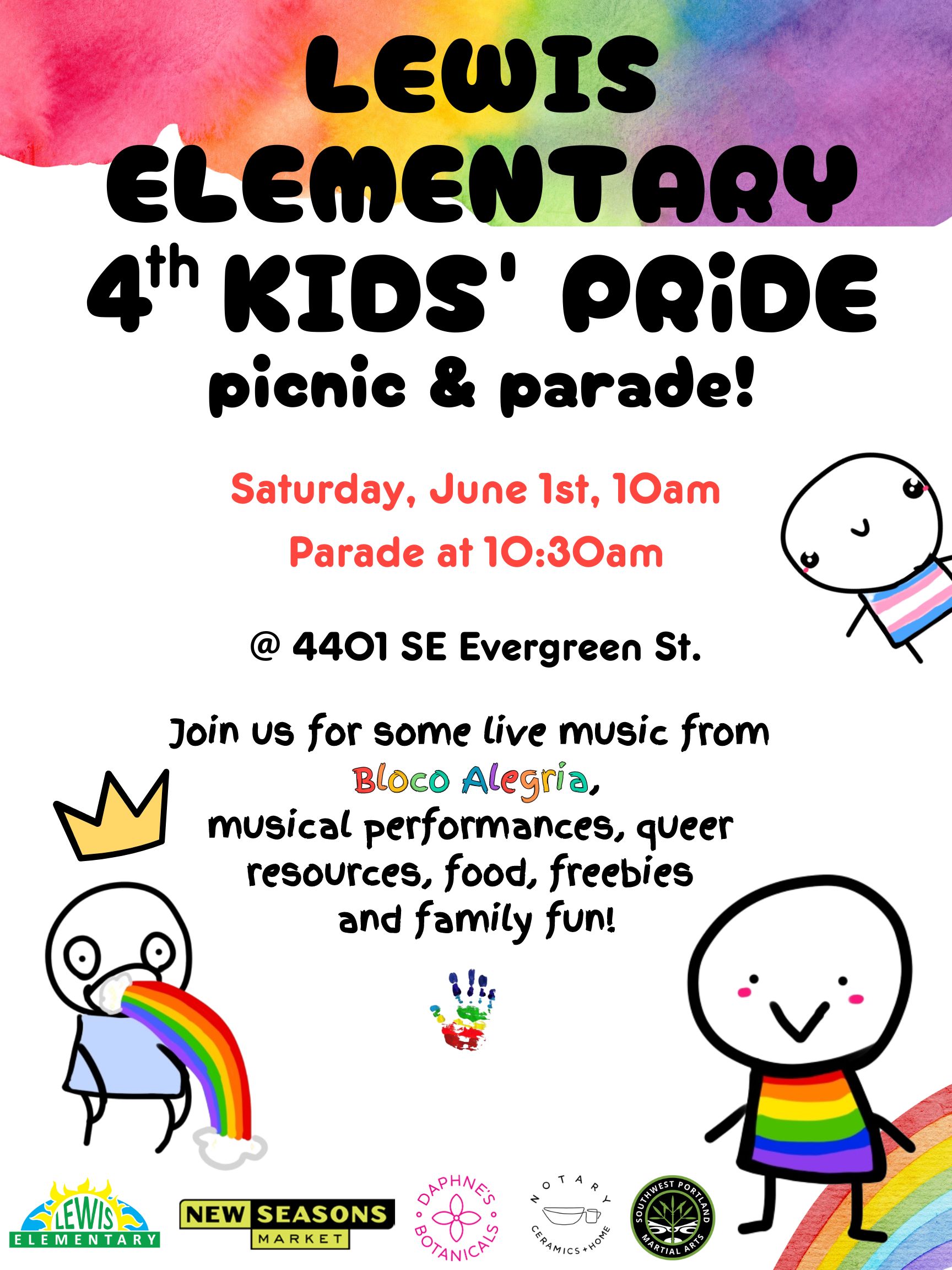 4th annual Lewis Elementary kids pride parade. Come march or ride with us! Kid and family friendly. Meet at 10:00am parade starts at 10:30 and will last approximately 40 min with events following. We are especially looking for extra adults to come ride with us, help cork, and help keep the march safe.