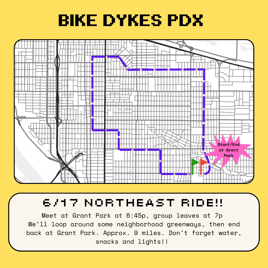 COME SEND IT Techno, House Tech, DnB, Hard Tech, some Psy??? This time stepping away from the classic Berlin hard style and finding influences from all over the World. Expect fast electrifying music. This is my (Bianca) favorite ride, so if you come dance with me ya'll make me the happiest. Come roll with us for the last Saturday of pedalpalooza to get all that energy out. Store stop, plenty of dance stops, short ride. As with all our rides, we practice consent and non-violence. Listen and empower ‘no’. If you have concerns please talk to the ride leader. We practice non-violence around car interactions, please be calm, respectful, friendly when corking or let someone else do it. Our default is to ask cars to stop, not make them.