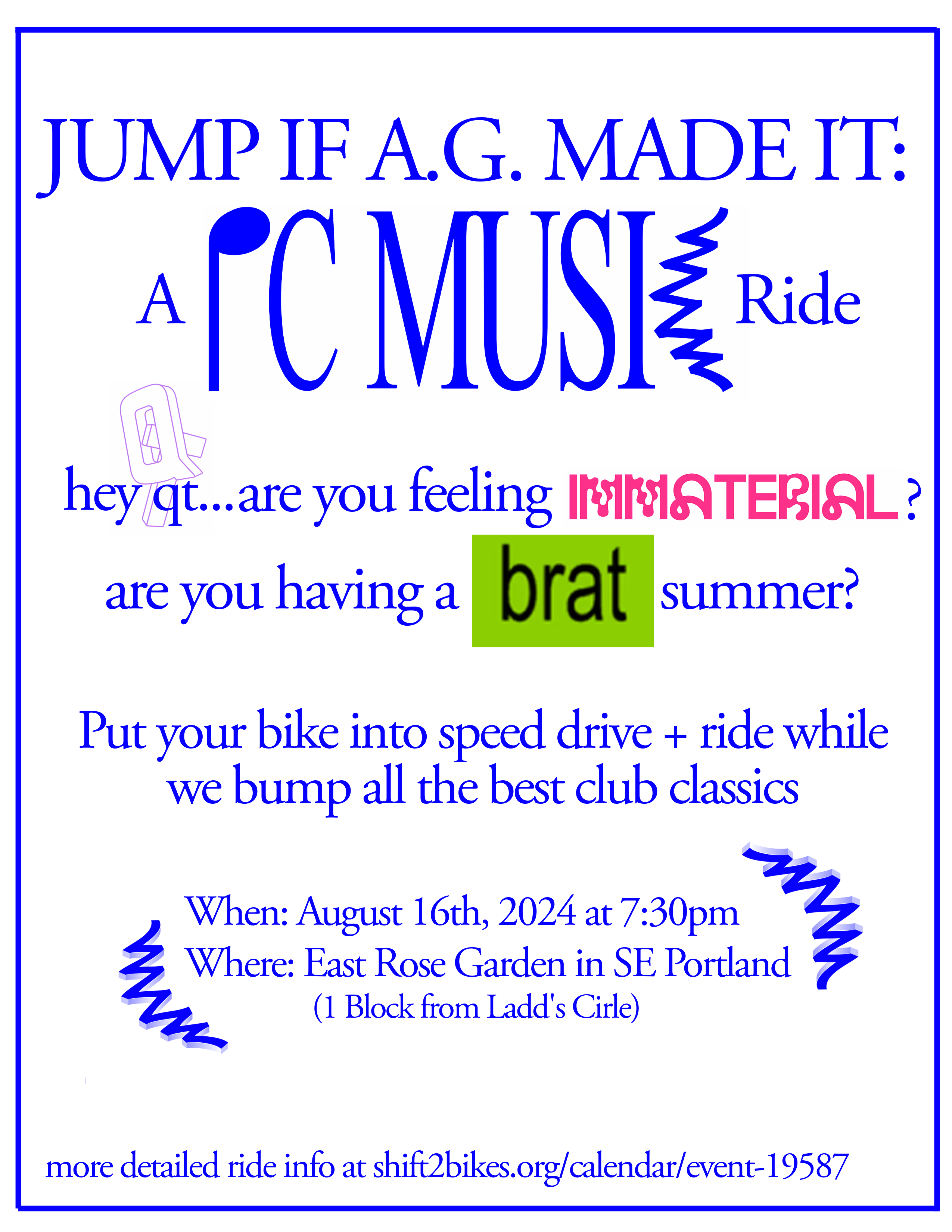 CANCELLED - JOINING LOUD AND LIT Summer is almost over, let's dance about it. With a playlist of energetic house hits, we'll flash mob around town and dance the night away. We'll make stops at various public spaces for 1-2 song flash mob dance parties while we encourage the public to join us. Meet at 8:45 - Ride by 9/9:15 End around 11/12 with dance party I have ~10 flash mob sites throughout inner NE, SE, and the waterfront pre-selected. Google maps says the ride would be 8.7 mi, 55 min riding straight through so I'd imagine we'll be somewhere between 2-3 hours. I have a backup shorter end spot if it's getting late. Open to impromptu stops based on the song, location, moment. Also feel free to hit me up on insta for song and flash mob site recs. Encouraged dress code: ~!ElectriC!~ ~!BrighT!~ ~!VibranT!~ ~!RaVe!~ ~!LightS!~ I have two big Soundboks speakers. You're welcome to play your own music if the ride is big enough, just make sure you're keeping your distance from the lead speaker and others so the bass isn't wonky. No one likes wonky bass. Dancing on your bike is highly encouraged, look like a silly goose and let it loose. Also, rather than following behind the ride leader like a line of ducks, lets try to surround me so when we stop, we're all ready to dance as soon as possible.